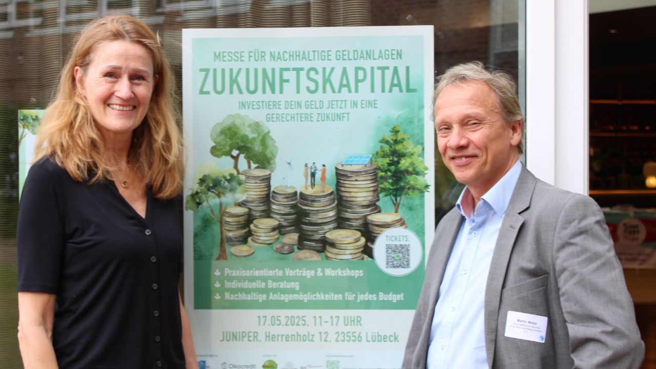 Diese fand am 17. Mai 2025 in Lübeck statt und machte nachhaltige Geldanlagen für Privatpersonen, Institutionen, Finanzdienstleister*innen und politische Entscheider*innen sichtbar. Zu den sozialen und ökologischen Investitionsmöglichkeiten gehörten nachhaltige Fonds, Mikrofinanzierungen, erneuerbare Energien und Beteiligungen an Genossenschaften. Zehn Aussteller*innen, darunter GLS Bank, Kulturland Genossenschaft, Prokon Energie Genossenschaft und Oikocredit Förderkreis Norddeutschland e.V. stellten ihre Ansätze vor. Daneben gab es ein abwechslungsreiches Informationsangebot für Besucher*innen, das auch zu Mythen zu grünen Geldanlagen aufklärte.